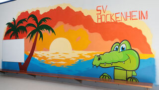Das Graffiti des Sonnenaufgangs ist mit dem Schriftzug des Schwimmvereins Hockenheim und einem Krokodil versehen.