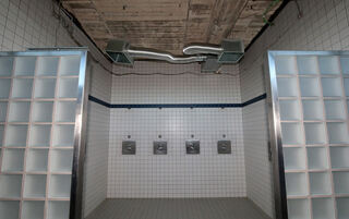Im Umkleideraum wurde die Decke aufgrund von Schadstoffen abgenommen und die Lüftung erneuert.