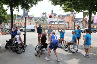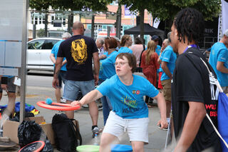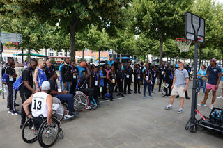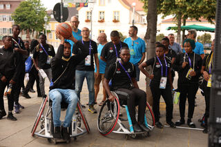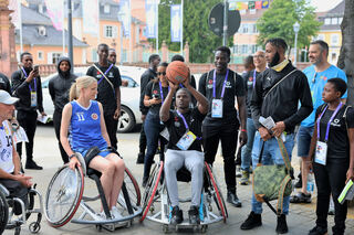 Am Stand von den MLP Academics Heidelberg und den SG Rolling Chocolate Heidelberg Kirchheim darf jeder mal Körbe werfen - aus dem Rollstuhl heraus.