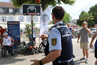 Auch die Polizei probiert sich aus beim Basketball am Stand der MLP Academics Heidelberg und den SG Rolling Chocolate Heidelberg Kirchheim.