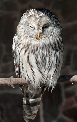 Der Habichtskauz sitzt in seiner gewohnten Umgebung.