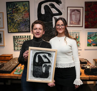 Frjor: Anna Becker (li., Künstlerin) und Lana Orsolic mit Kunst zum Thema "Meerjungfrau".
