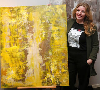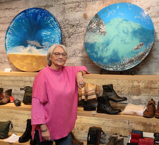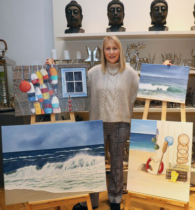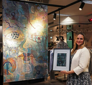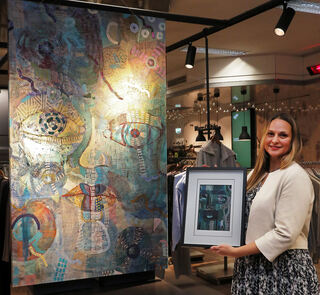 Bräuninger: Nina Kruser mit dem Kunstwerk "Unter der Maske" in der Hand. Das große Bild heißt "Kalimera Kriti".