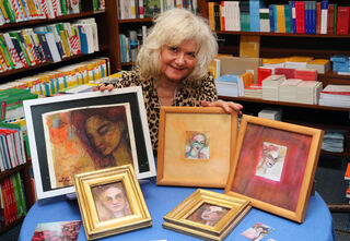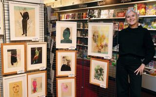 Buchhandlung Kieser: Eva Clemens mit kleinen Porträts in Mischtechnik auf Papier.