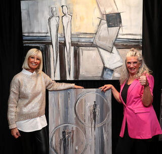 TILLMANNS textiles Wohnhandwerk: Gabriela Futterer (li.) und Petra Tillmanns vor Acrylmalerei.