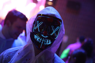 In der Dunkelheit leuchtet die Maske eines Besuchers des "Schmudos."