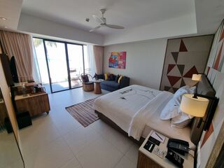 Crossroads Maldives: Blick in das Zimmer eines Standappartements vom Hard Rock Hotel. Alles ist sehr modern und lässig gestaltet.