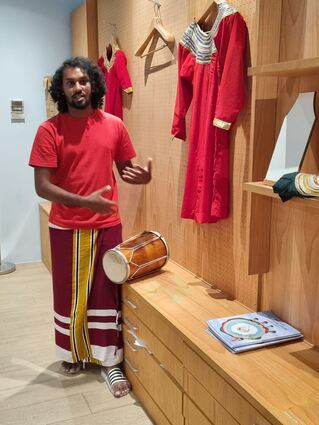 Sultan vom Discovery Centre auf Crossroads Maldives trägt die traditionelle Kleidung für Männer. An der Wand ist das Gewand für Frauen zu sehen.