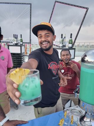 Alkohol gibt es auf den Malediven nur in den Hotels und Resorts wie hier vom Team des Hard Rock Cafés auf Crossroads Maldives.