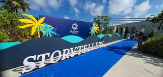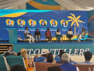Das Podium der Storytellers Conference 2023. Klimapolitikerinnen der Malediven sprechen mit international bekannten Journalisten, Autoren und Influencern.