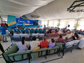 Das ist doch mal Konferenzflair: Loungemöbel und weißer Sand unten den Füßen. Da macht das Zuhören bei knapp 30 Grad Celsius durchaus Laune.