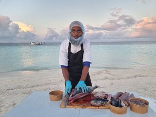 Die Fischerei ist der zweitgrößte Wirtschaftszweig der Malediven. Auch hier dominiert das Thema Nachhaltigkeit. Afrah ist 32 Jahre alt und lebt auf der Insel Hirilandhoo auf den Malediven. Er ist ein stolzer Fischer wie seine Vorfahren und zeigt hier, wie man Thunfisch zerlegt.