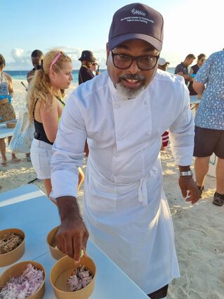 Naheez Abdul Ghafoor ist Manager und Chef bei MIFCO, Maldives Industrial Fisheries Company Limiteda. Er zeigt hier, wie man Mashuni zubereitet, ein klassisches Gericht aus Thunfisch, Kokos, Zwiebeln, Kräutern, Gewürzen und Limettensaft.