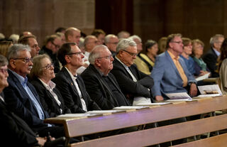 In der ersten Reihe sitzen Bischof Dr. Karl-Heinz Wiesemann (v. r.), Weihbischof Otto Georgens und Domdekan Dr. Christoph Kohl.