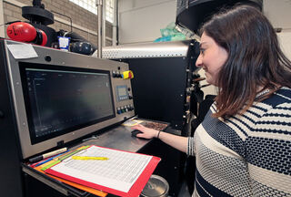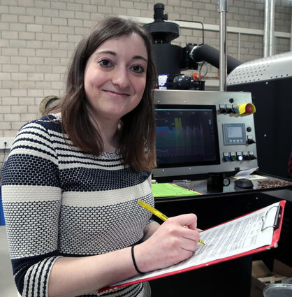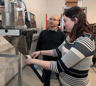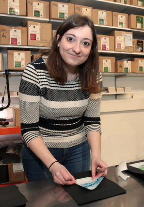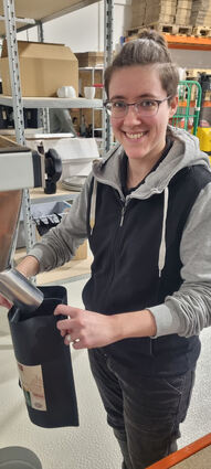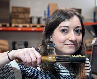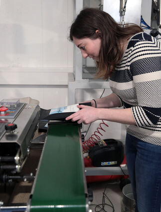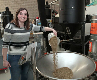 Michelle Braun füllt den gerösteten Kaffee in die Packung ab.