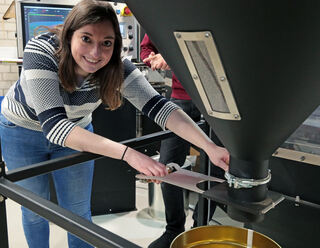 Der geröstete Kaffee wird in Metalleimer umgefüllt. Redakteurin Vanessa Schwierz schiebt die Platte nach hinten, damit der Kaffee in den Eimer fallen kann.