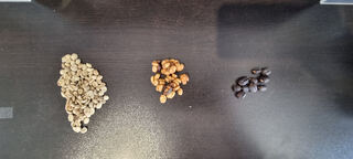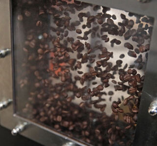 Die Röstmaschine ist digital und wird per Computer gesteuert. Die Röstprogramm sind gespeichert. Per Mausklick geht es los, die Bohnen fallen in die Röstmaschine.