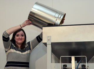 Der fertige Kaffee wird in einen Trichter der Abfüllanlage gefüllt.