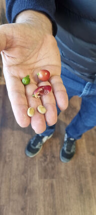 Im ersten Stadium ist die Kaffeekirsche grün, dann reift sie ins hellrote, bis sie dunkelrot wird. Dann ist sie reif und die zwei Samen – die Bohnen – können entnommen werden.