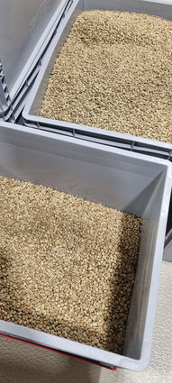 Von den Säcken werden die Bohnen in solche Kisten umgefüllt, die an der Röstmaschine bereits stehen, um geröstet zu werden.