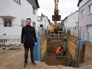Ortsbaumeister Nico Rößler ist mit den Fortschritten sichtlich zufrieden: Im Bereich der Kreuzung Enderle- und Bahnhofstraße laufen die Vorbereitungen für das nächste tonnenschwere Verbindungsbauteil, das im April kommen soll.