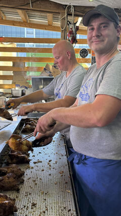 Kein einfacher Job: Axel und Bernd am Hähnchengrill - hier wird es über 200 Grad heiß.