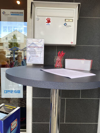 Die Kontaktdaten werden noch außerhalb des Foyers erfasst.