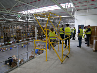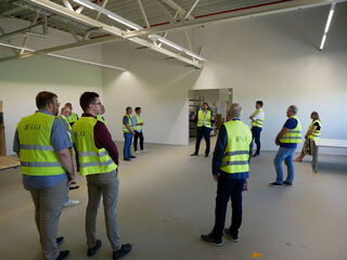 Standortleiter Maximilian Diefenthäler (vor dem Durchgang) führt Besucher der Einweihungsfeier durch das Logistikzentrum.
