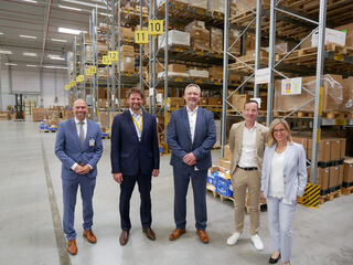 Freude über die Einweihung vor dem Hochregallager (v. l.): Bürgermeister Timo Wangler, LGI-Standortleiter Maximilian Diefenthäler, Bernd Schwenger (Vorsitzender der Geschäftsführung LGI), Holger Funk (Geschäftsführer Finanzen LGI) und Martina Weihing ("Electronics & Health Care" LGI).