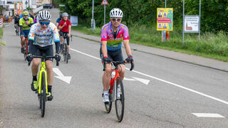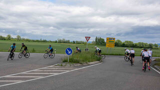 Knapp 20 Fahrerinnen und Fahrer starten zu der Benefiztour auf dem Rheindamm.
