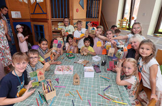 Regine Heißler (r.) bastelte mit den Kindern Häuschen aus Pappkarton.