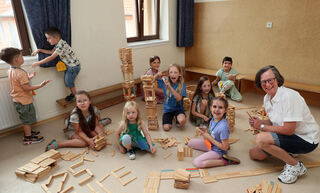 Silke Kester (r.) baut mit den Kindern Türme und Straßen mit "Kapla".