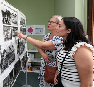 Sandra Löschmann und Denise Mulaku sehen sich alte Bilder der Ausstellung "100 Jahre Kindergarten" an.