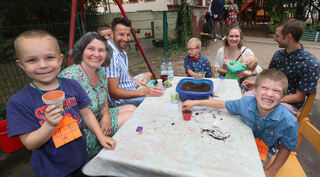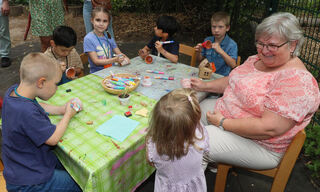 Simone Mack (r.) bemalt mit den Kindern kleine Tontöpfe mit Acyylmarker.