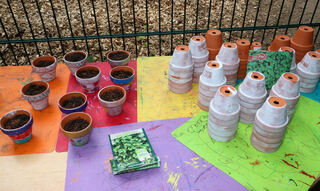 Unter Anleitung von Heike Quitt (2. v.l.) werden die zuvor bemalten kleinen Tontöpfe mit Kresse bepflanzt.
