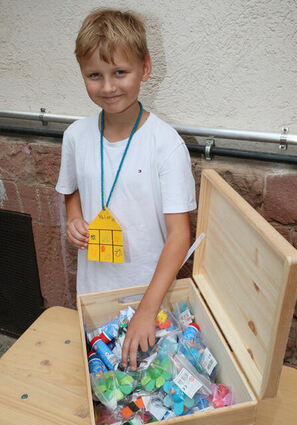 Valerii (10 ) hat seine Stempelkarte für die Spielestationen voll und darf sich nun einen Preis aus der Schatzkiste nehmen.