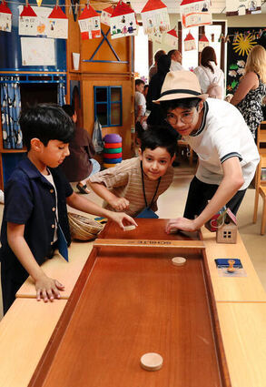 Momin (5), Siyar (4) und Shahir haben Spaß beim Shuffleboard.