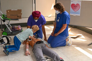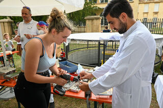 Eine junge Besucherin schraubt eine Schraube in einen Knochen.