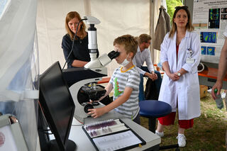 Bei der Diagnostik schaut eine Junge in ein Mikroskop.