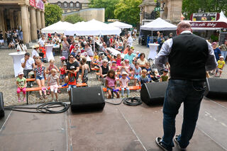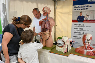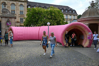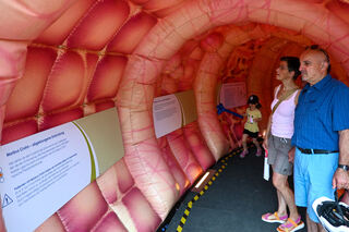 Besucher betreten das Darmodell beim Jubiläum des Klinikum Mannheim.