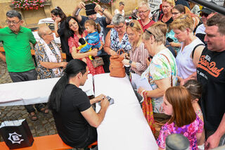 Comedian Bülent Ceylan überbringt eine Spende und signiert Autogramme.