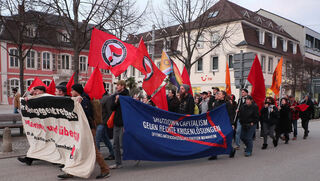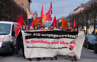 Über die Carl-Theodor-Straße zieht die OAT sowie die Antifaschistische Initiative Heidelberg in Richtung Schlossplatz.