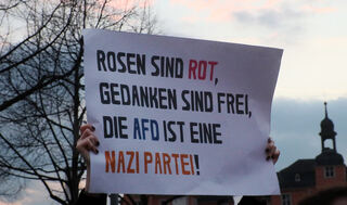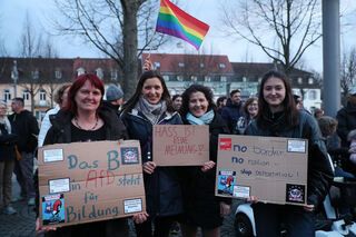 Rund 200 Menschen sind auf den Schlossplatz gekommen, um gegen die Veranstaltung der AfD zu protestieren.