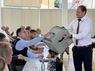 Die Jugendvertreter Levi Betz (l.) und Emma Keller am Glücksrad. Richtige Antworten auf Fragen rund um die Demokratie wurden mit Süßigkeiten belohnt.