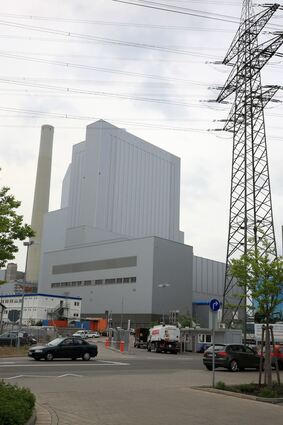 Der neue Block 9 am Rheinufer mit seinem 180 Meter hohen Schornstein.