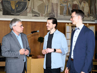 Abteilungsleiter Georg Pflästerer (v. l.) verlieh die Schulmedaille an Leon Walther und Josia Daumüller für die besten Leistungen. Bild: Widdrat