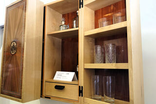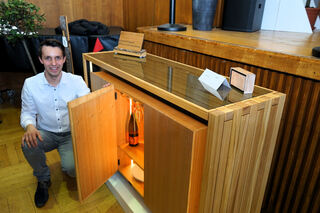 Das Meisterprüfungsprojekt von Jerôme von Rège ist ein Barschrank aus Eiche, die Marketerie besteht aus Zwetschge. Bild: Widdrat