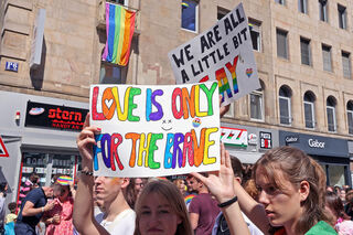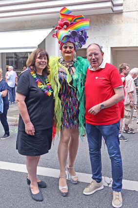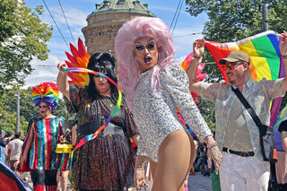 Perfekt geschminkte Dragqueens in glitzernden Outfits und High Heels flanieren stolz über die Straße oder fahren in Cabrios.