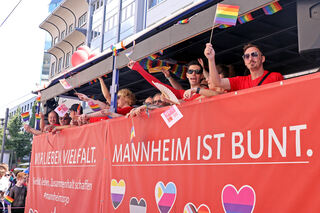Die Parade, die sich gegen Diskriminierung der LGBTQIA*-Community stark macht, hat die Quadrate in ein buntes Farbenmeer verwandelt.