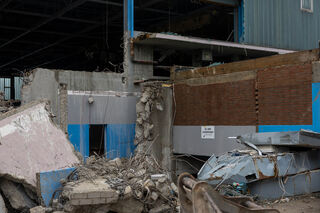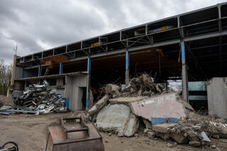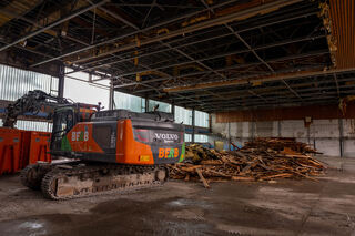 Vor der Halle stapeln sich die alten Gebäudeteile.